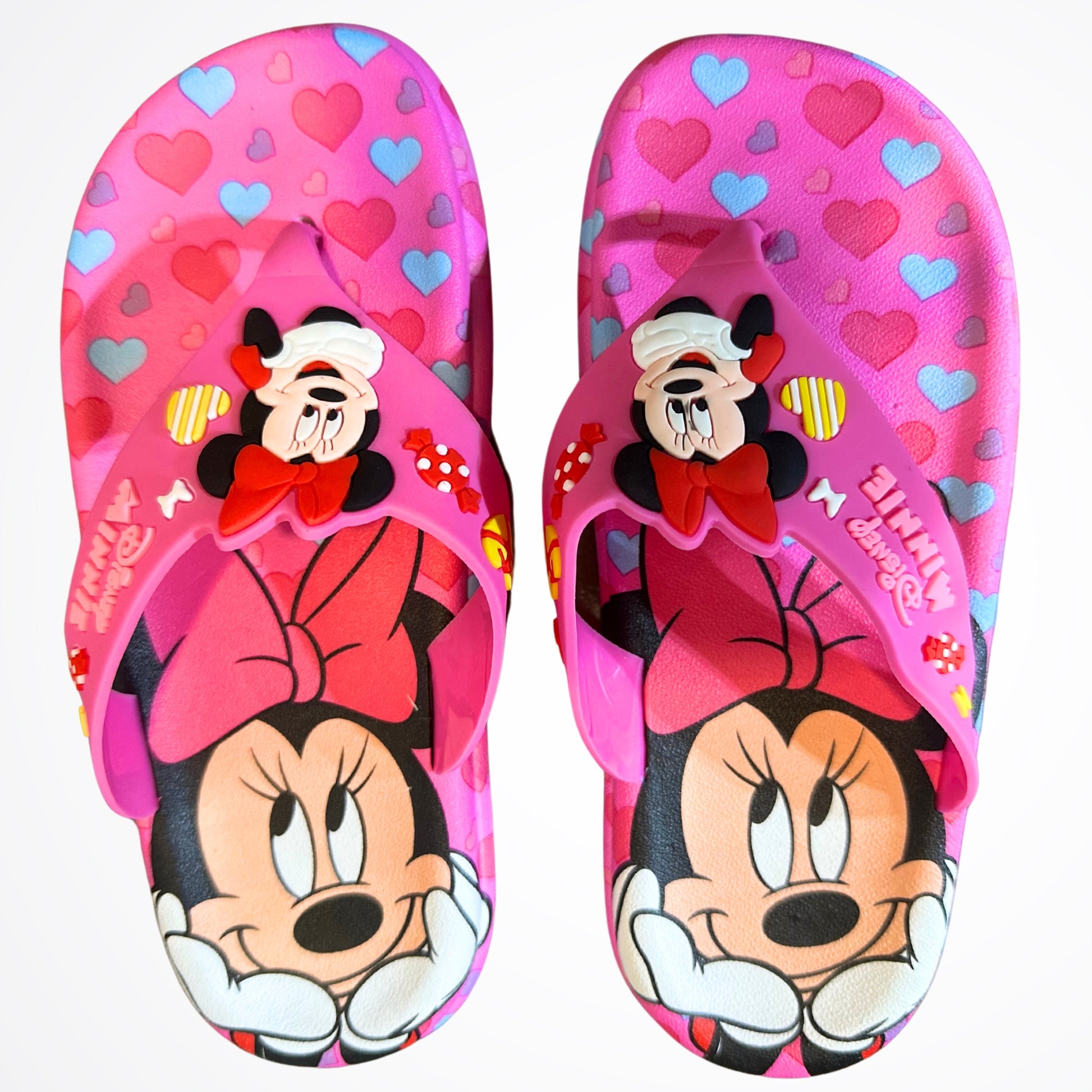 Step into style with our Minnie Mouse Hearts Fuchsia Flipflops! These playful sandals feature a charming design of Minnie Mouse surrounded by hearts, perfect for a day at the beach or a stroll in the park. With a comfortable fit and cute design, these flipflops are the perfect addition to any summer wardrobe. Time to add a dose of cuteness to your shoe game!