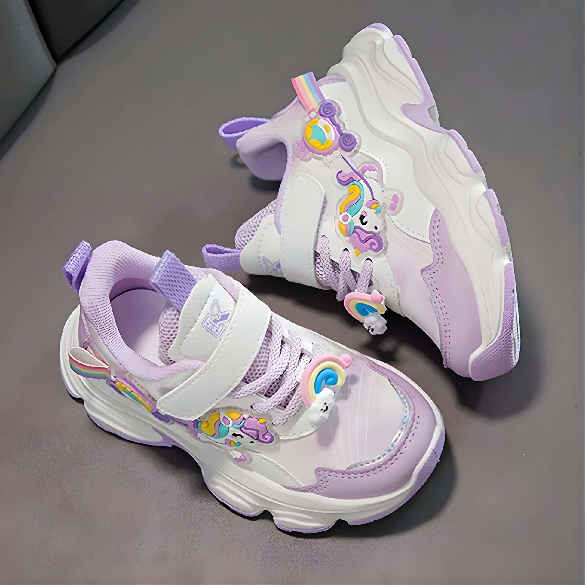 Step into a world of magic with these Unicorn White/Purple Sneakers! Featuring a whimsical blend of white and purple hues, these sneakers bring a playful splash of color to every outfit. Designed for comfort and charm, they make every step feel like a joyful adventure. Perfect for little dreamers who want to add a touch of fantasy to their everyday style.